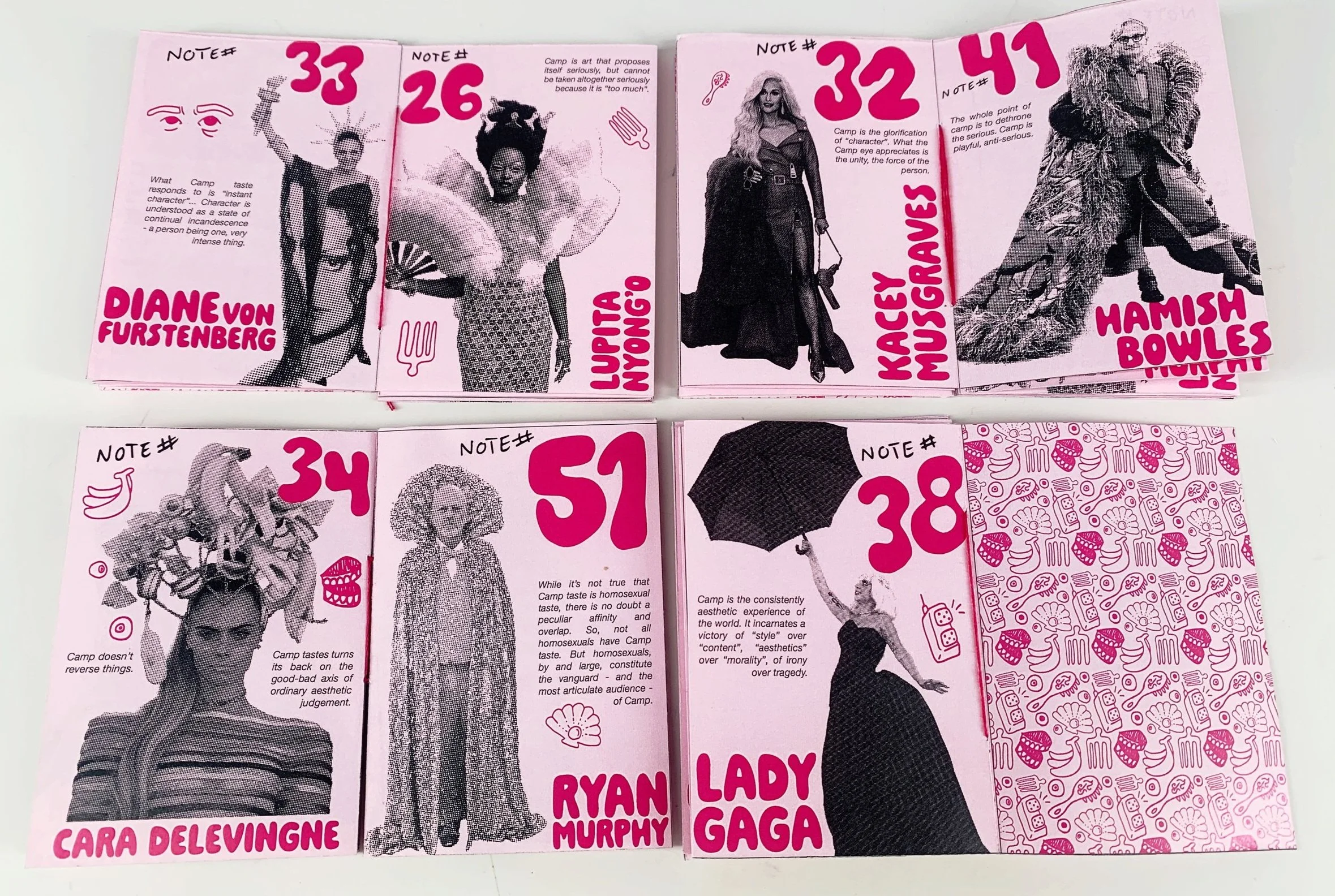 For this project, I filtered through all of the CAMP Met Gala outfits and fashion and picked out my favorites that follow Susan Sontag’s publication, “Notes on Camp”. I paired the photos of the outfits with an article of Sontag’s work that acts as a citation source for why the outfit works on theme. The inside covers are illustrations inspired by the outfits in the zine and are done by me.